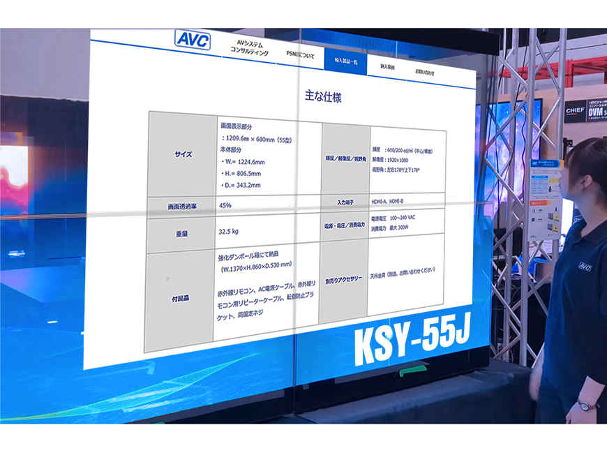 色の濃いコンテンツ部分が透過表示される、55型 OLEDディスプレイモニターです。PCやメディアプレーヤーなど、一般的な映像ソースを接続して利用することができます。