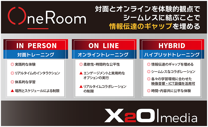 - 没入型ハイブリッド・バーチャルラーニングソリューション「X2O・OneRoom」はお客坂の用途・利用環境・既存映像音響設備の内容によって自由にカスタマイズできるソリューションです。詳細についは是非お気軽にお問い合わせください。